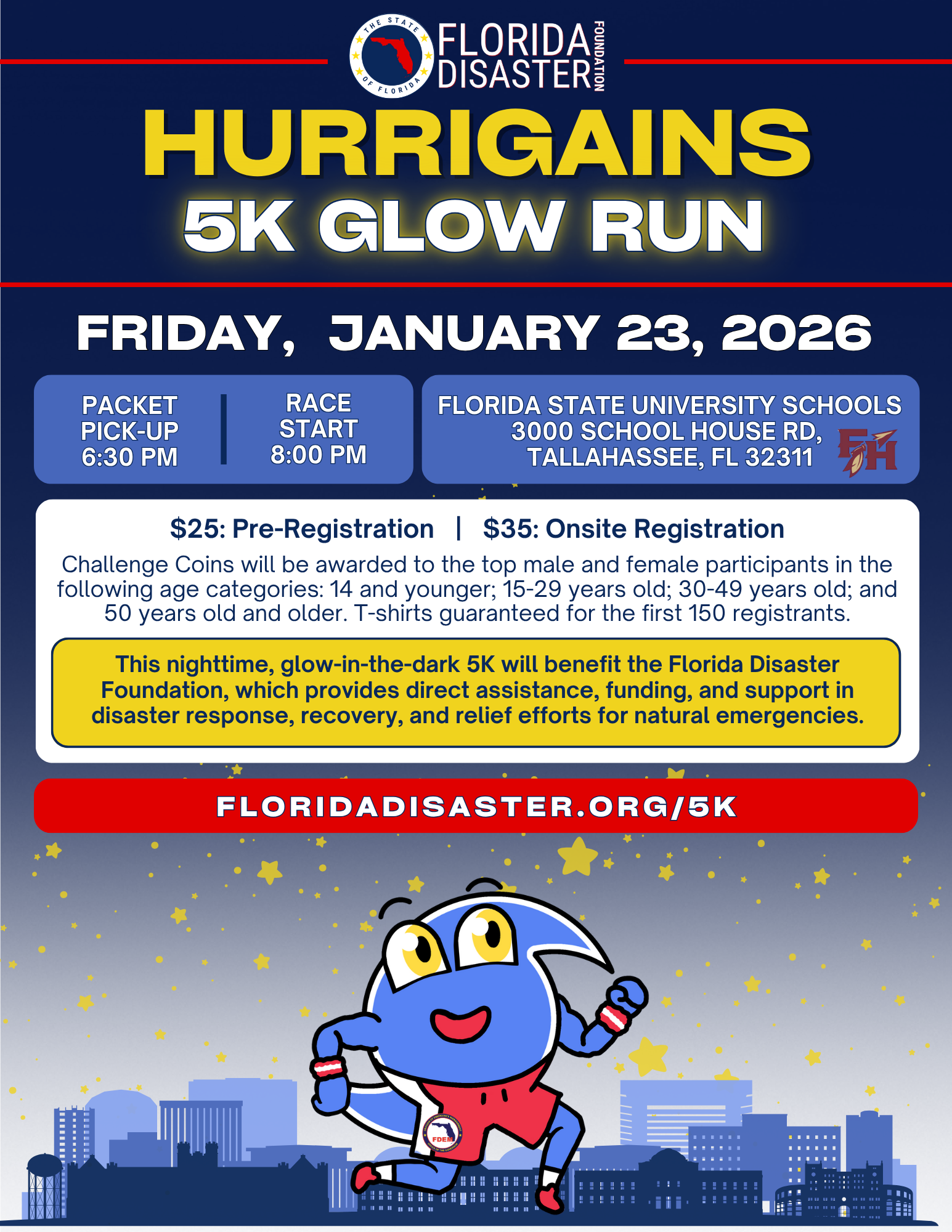 This nighttime, glow-in-the-dark 5K will benefit the Florida Disaster Foundation, which provides direct assistance, funding, and support in disaster response, recovery, and relief efforts for natural emergencies.