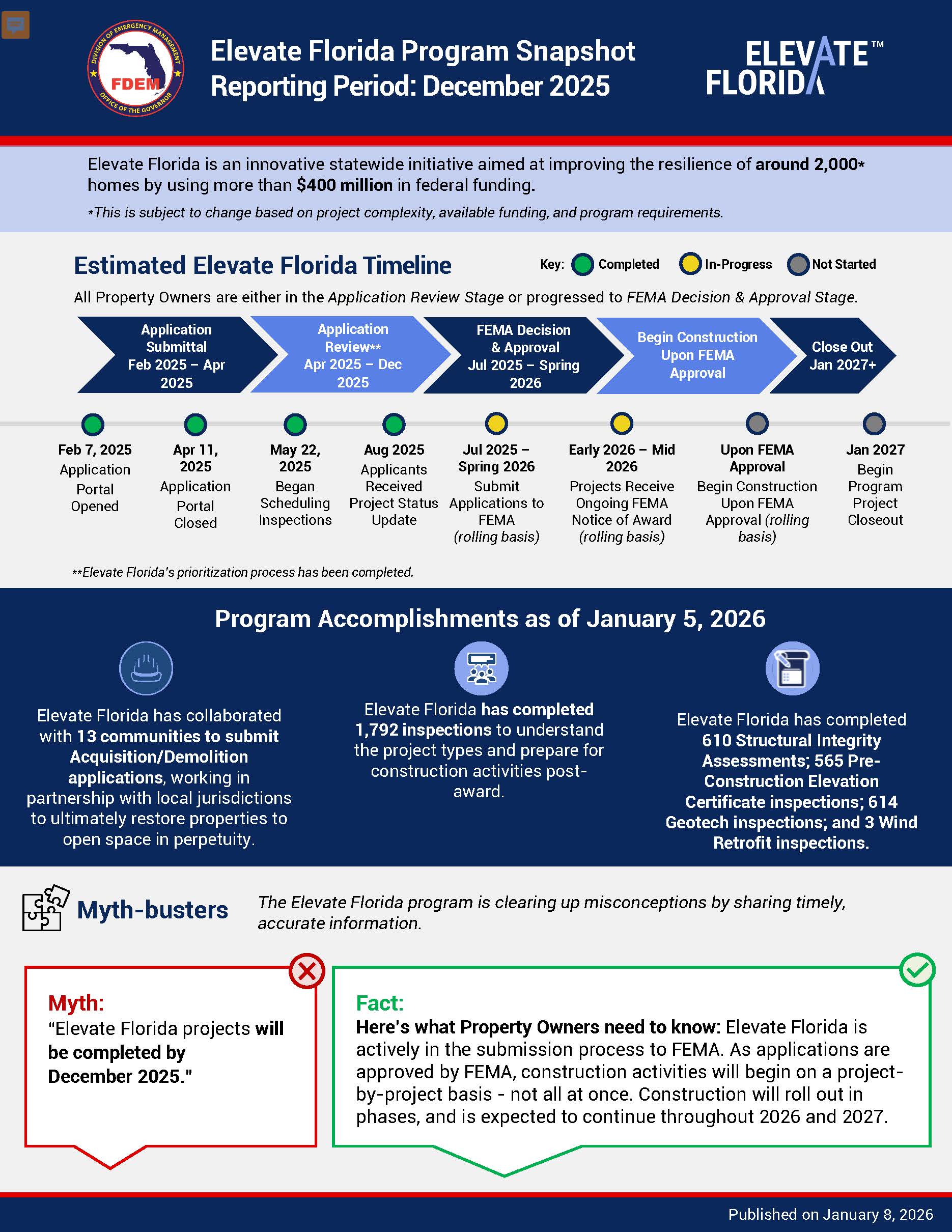 Elevate Florida is a first-of-its-kind, groundbreaking statewide residential mitigation program. Led by the Florida Division of Emergency Management (FDEM), this program is designed to protect homes and communities by reducing damage caused during natural disasters like hurricanes and floods.