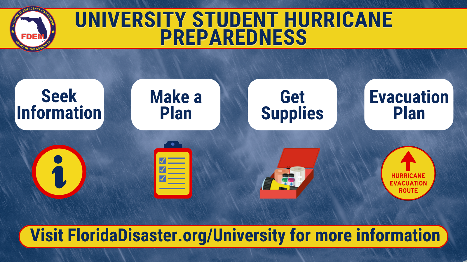 Whatever county your university is in also has an Emergency Management department with local resources and information. A list of contacts for all Florida counties is available at FloridaDisaster.org/Counties.