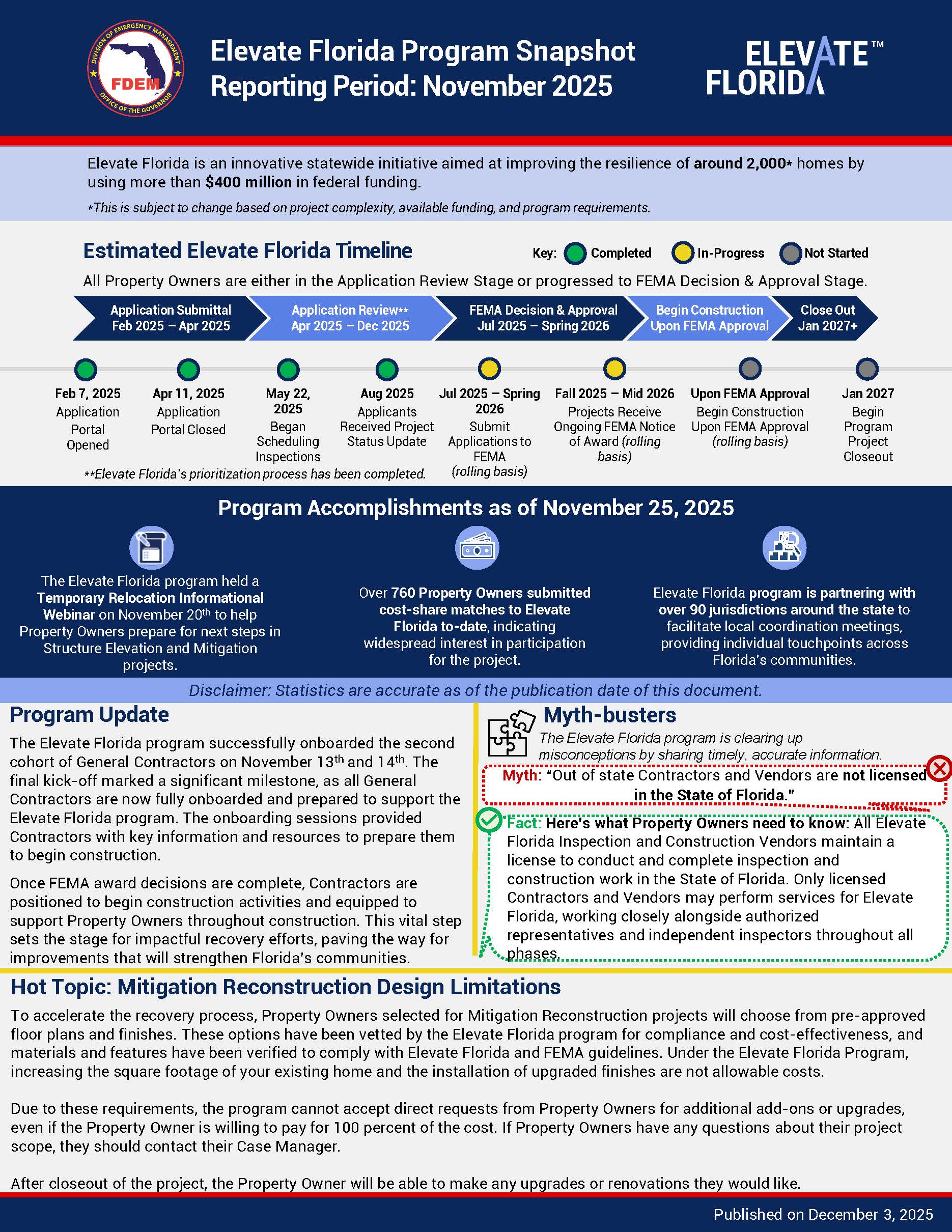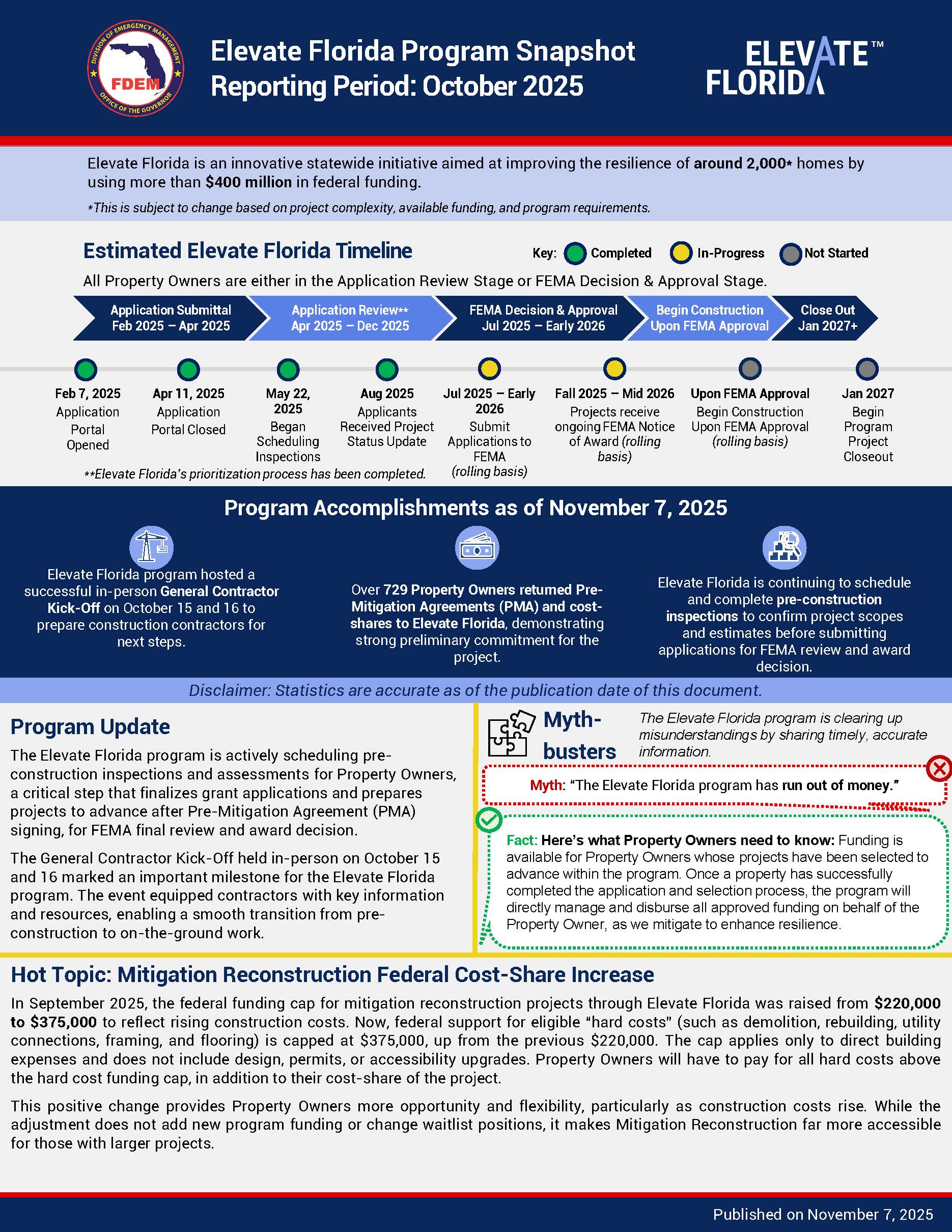 In September 2025, the federal funding cap for mitigation reconstruction projects through Elevate Florida was raised from $220,000 to $375,00 to reflect rising construction costs. Now, federal support for eligible "hard costs" (such as demolition, utility connections, framing, and flooring) is capped at $375,000, up from the previous $220,000. The cap applies only to direct building expenses and does not include design, permits, or accessibility upgrades. Property Owners will have to pay for all hard costs above the hard cost funding cap, in addition to their cost-share of the project.
