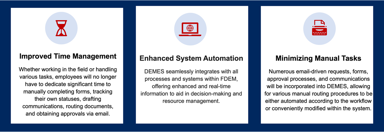 DEMES is a modern, cloud-based platform designed to streamline and digitize the Florida Division of Emergency Management’s (FDEM) operations. Built on Salesforce, DEMES integrates previously siloed systems and manual processes into a unified environment that enhances speed, accuracy, and transparency across bureaus and partner agencies. It is a versatile system that supports a wide range of functions, including Grants Management, Mutual Aid Coordination, Finance, Procurement, Resource Management, HR Operations, and Help Desk support. Designed to streamline processes, DEMES offers both internal applications for FDEM staff and external portals for partners, enabling effective communication and collaboration.