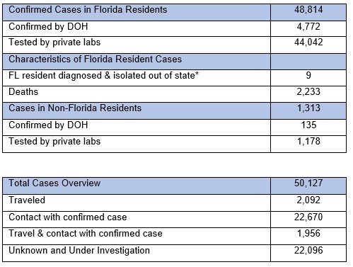There are a total of 50,127 Florida cases*** with 2,233 deaths related to COVID-19.